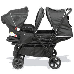 Dans cette configuration, un siège est positionné derrière l’autre. Cela réduit la largeur de la poussette et améliore la maniabilité dans les espaces étroits.